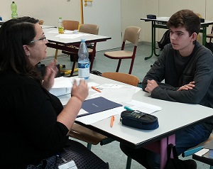 Ein absoluter Höhepunkt für die Klasse Z10b war der Besuch von Eva Palopoli, Ausbildungsleiterin bei DB Schenker, die drei Schulstunden lang ein Bewerbungstraining durchführte. Sie ging auch auf die Merkmale guter Bewerbungsmappen ein. Unsere Schülerinnen und Schüler konnten ein schlechtes Anschreiben korrigieren und Fragen zum Thema stellen, die die Expertin umfassend beantwortete. Dann besprach Frau Palopoli noch mit den Schülerinnen und Schülern, die ihr vorab ihre Mappen abgegeben hatten, die Schwachstellen. Die Zeit verging sehr rasch. Deshalb wurde die große Pause für ein Bewerbungsgespräch genutzt. Dankenswerterweise stellte sich Lukas hierfür zur Verfügung, während einige Mitschüler als Beobachter zum Beispiel zu seinem Auftreten und seiner Kommunikationsfähigkeit fungierten. In einer Feedbackrunde zeigten sich die Frenzelschüler begeistert vom anschaulichen und abwechslungsreichen Vormittag.